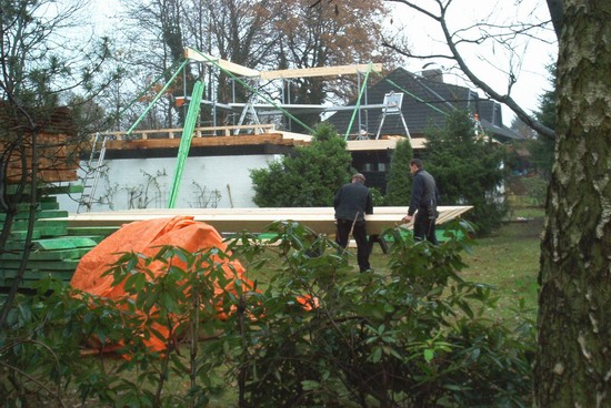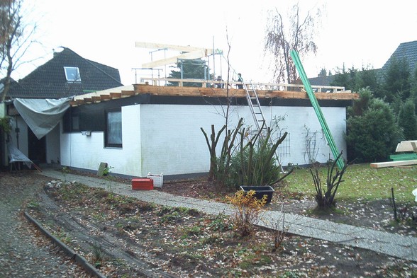 | Der Zimmermann ist nahezu fertig, die Gauben fehlen noch | |||